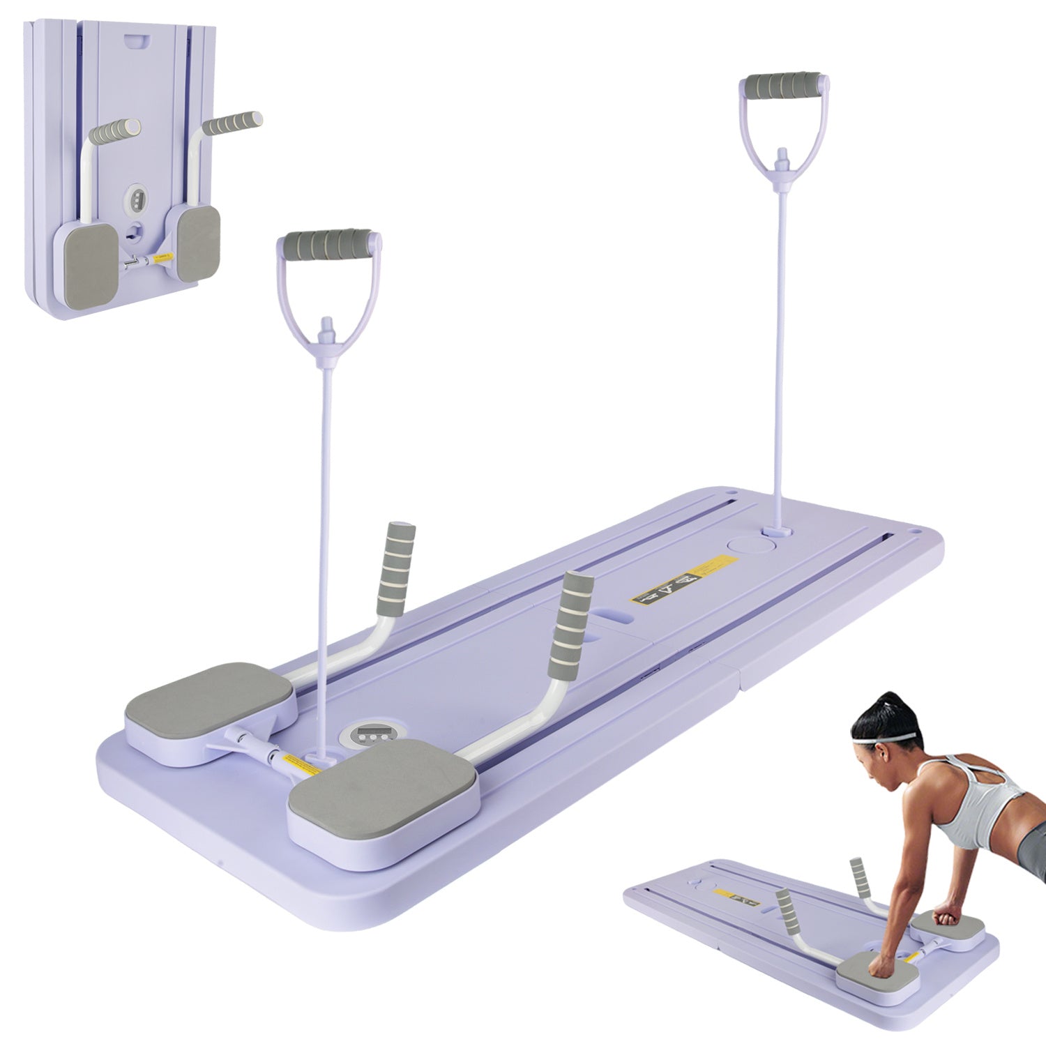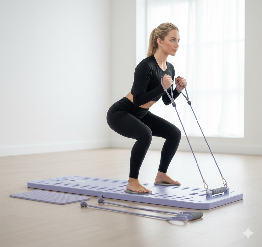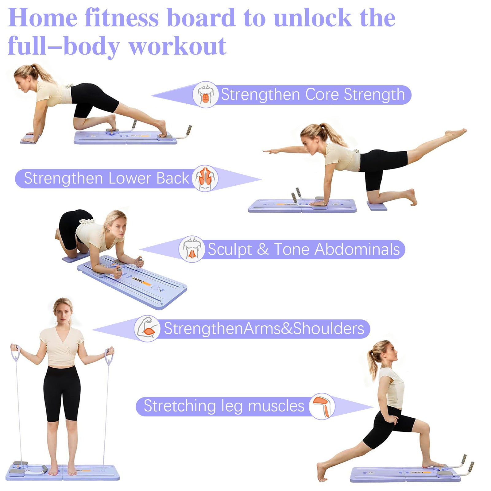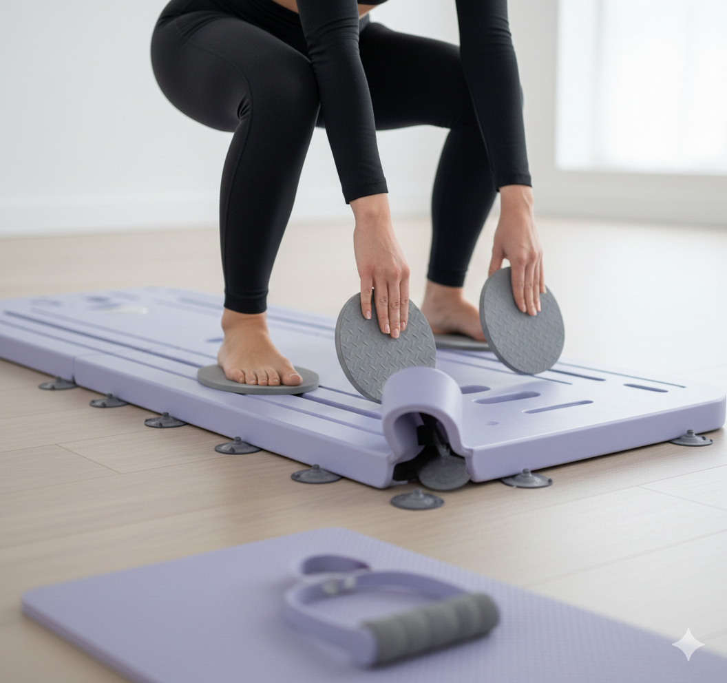 Plaats het board op een vlakke, stabiele ondergrond en controleer of alle onderdelen stevig vastzitten. Bevestig de elastieken of weerstandsbanden aan de daarvoor bestemde haken. Ga in een stabiele positie liggen of zitten en pak de handgrepen vast. Voer de oefening gecontroleerd uit, met een rustige en gelijkmatige beweging.